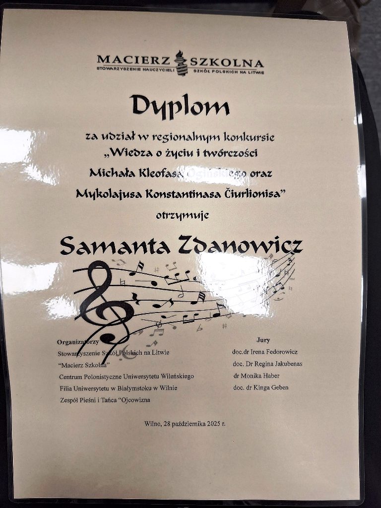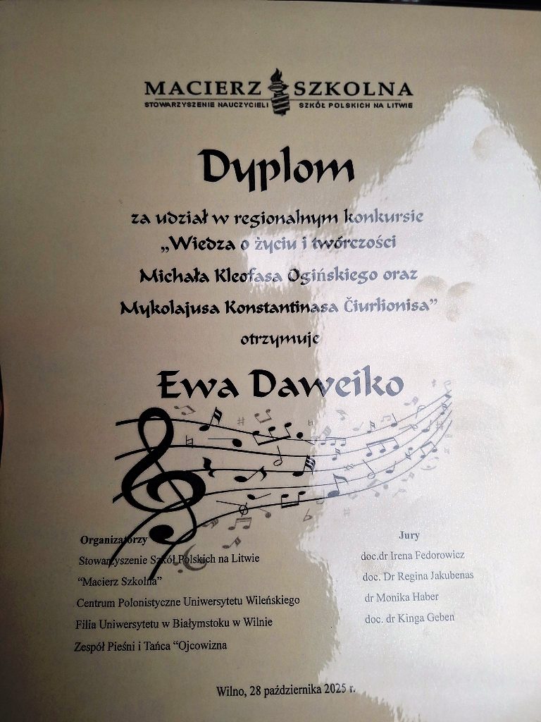 Spalio 28 dieną, 9 klasės mokinės Ewa Davejko ir Samanta Zdanovič dalyvavo konkurse „Žinios apie Mykolo Kleopaso Oginskio ir Mykolo Konstantino Čiurlionio gyvenimą ir kūrybą“, kuris vyko Balstogės universiteto filiale Vilniuje. Iš pradžių mokinės klausėsi paskaitų apie Mistrus, o vėliau dalyvavo konkurse. Konkurencija buvo didelė. Nuoširdžiai dėkojame mergaitėms už norą dalyvauti konkurse. Tai buvo nuostabi patirtis.