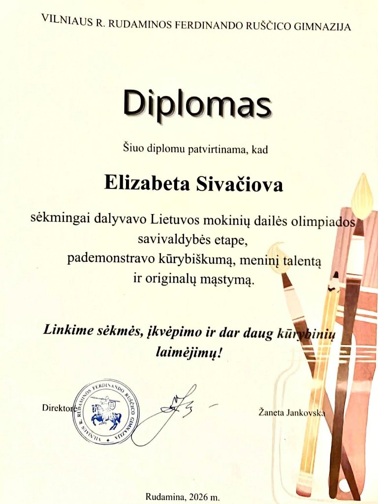 Vasario 25 d. mūsų mokyklos mokinė Elizabeta Sivačiova dalyvavo dailės olimpiados rajoniniame etape, kurio tema – „Nuo Žemaitės iki Marcės Katiliūtės: moterų kūrybos vizijos“. Olimpiadoje mokinė gilinosi į moterų kūrybos raidą, menines idėjas ir jų reikšmę Lietuvos kultūrai.