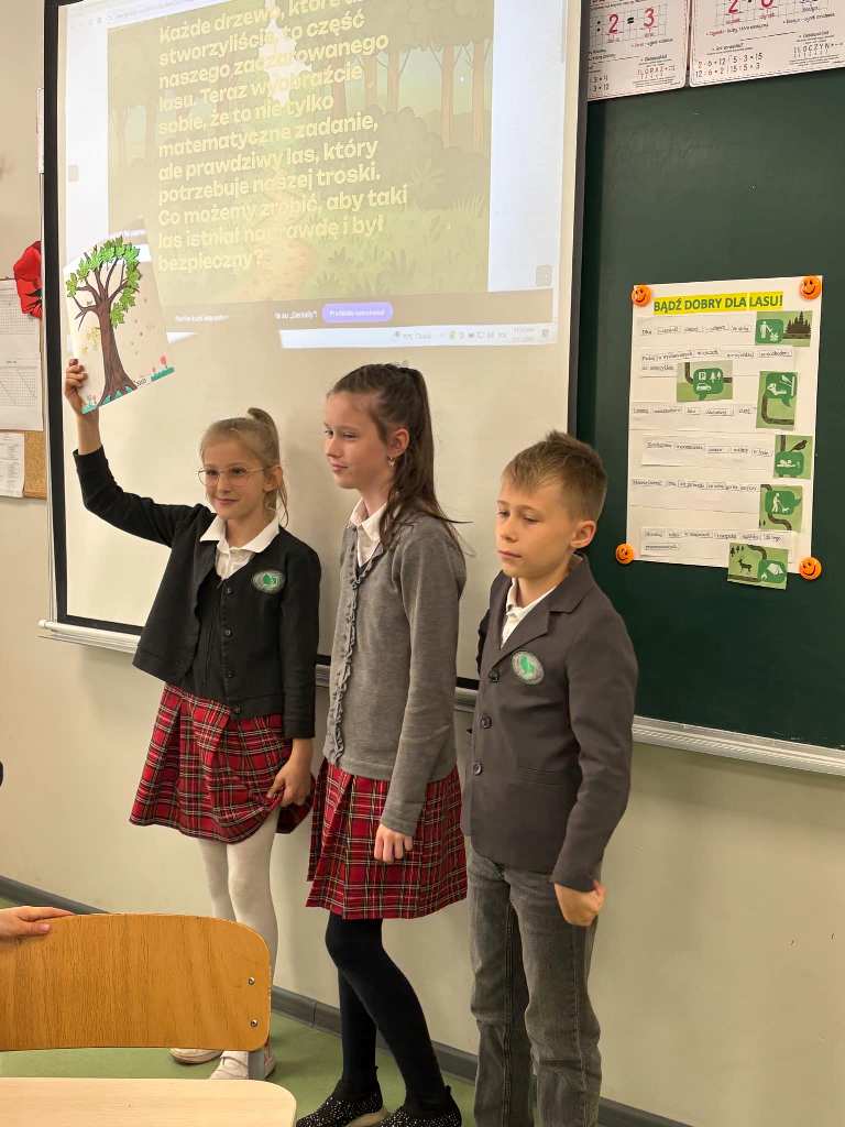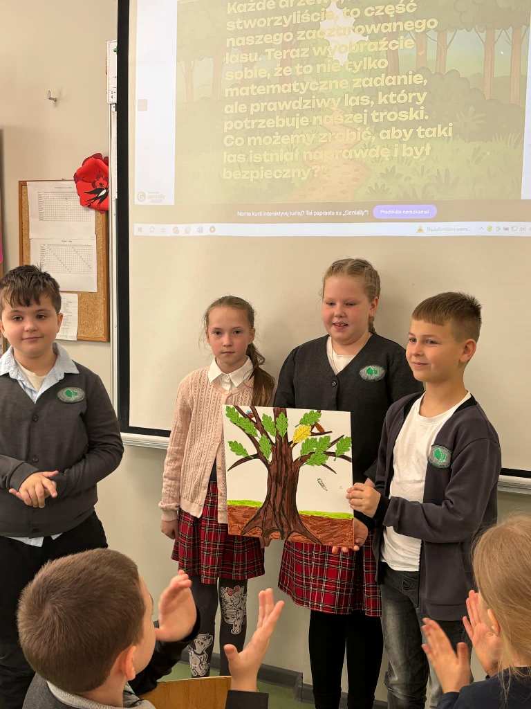 Podczas lekcji matematyki ,,W zaczarowanym lesie. Obliczanie pola, obwodu prostokąta i kwadratu” (naucz. Bożena Geglis) uczniowie kl. 3 pracując w grupach wykonywali karty pracy, ćwiczenia interaktywne, mające na celu utrwalenie wiedzy matematycznej, jak również kształcenie kompetencji uczenia się, społecznych i cyfrowych. Dużym atutem lekcji było wplecenie elementu narracyjnego (zaczarowany las), co czyniło zajęcie bardziej atrakcyjnym i angażującym dla dzieci.