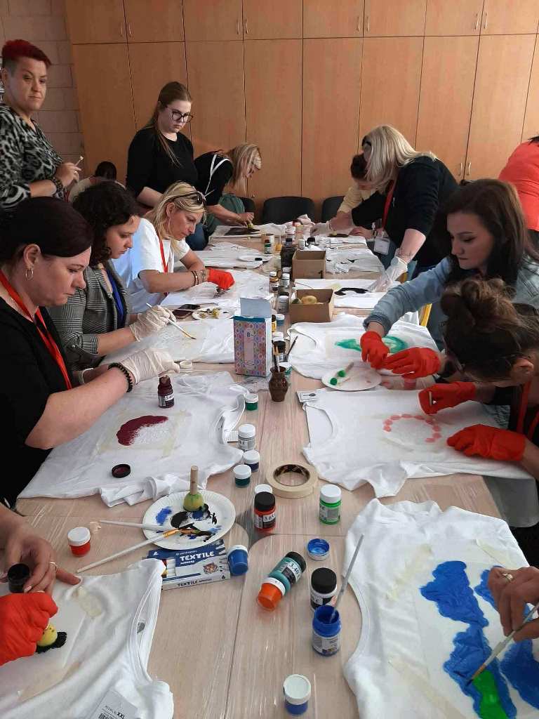 Następnie nasi goście wzięli udział w zajęciu artystycznym,prowadzonym przez naucz. Czesławę Lachowicz, projektując i malując własne wzory na koszulkach.