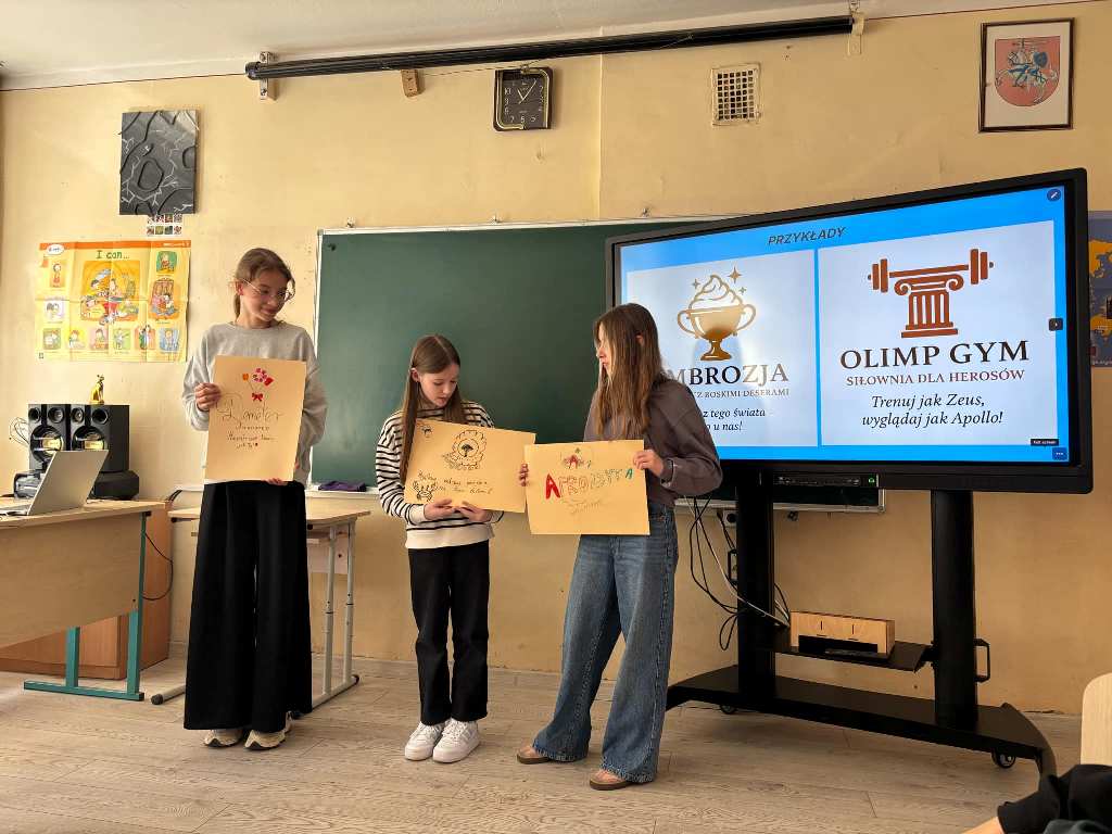 W ramach wtorkowego programu (20 maja) goście z Polski i Słowacji mieli okazję uczestniczyć w 5 zajęciach pokazowych. Na lekcji jęz. polskiego ,,Z wizytą na Olimpie – wśród greckich bogów” (naucz. Justyna Breivė) uczniowie kl.6 nie tylko w sposób atrakcyjny utrwalili wiedzę na temat mitologii greckiej, ale również zastosowali wiedzę w działaniach twórczych, tworząc firmę mitologiczna, co uczyniło temat bliskim uczniom i pobudziło ich kreatywność i przedsiębiorczość.